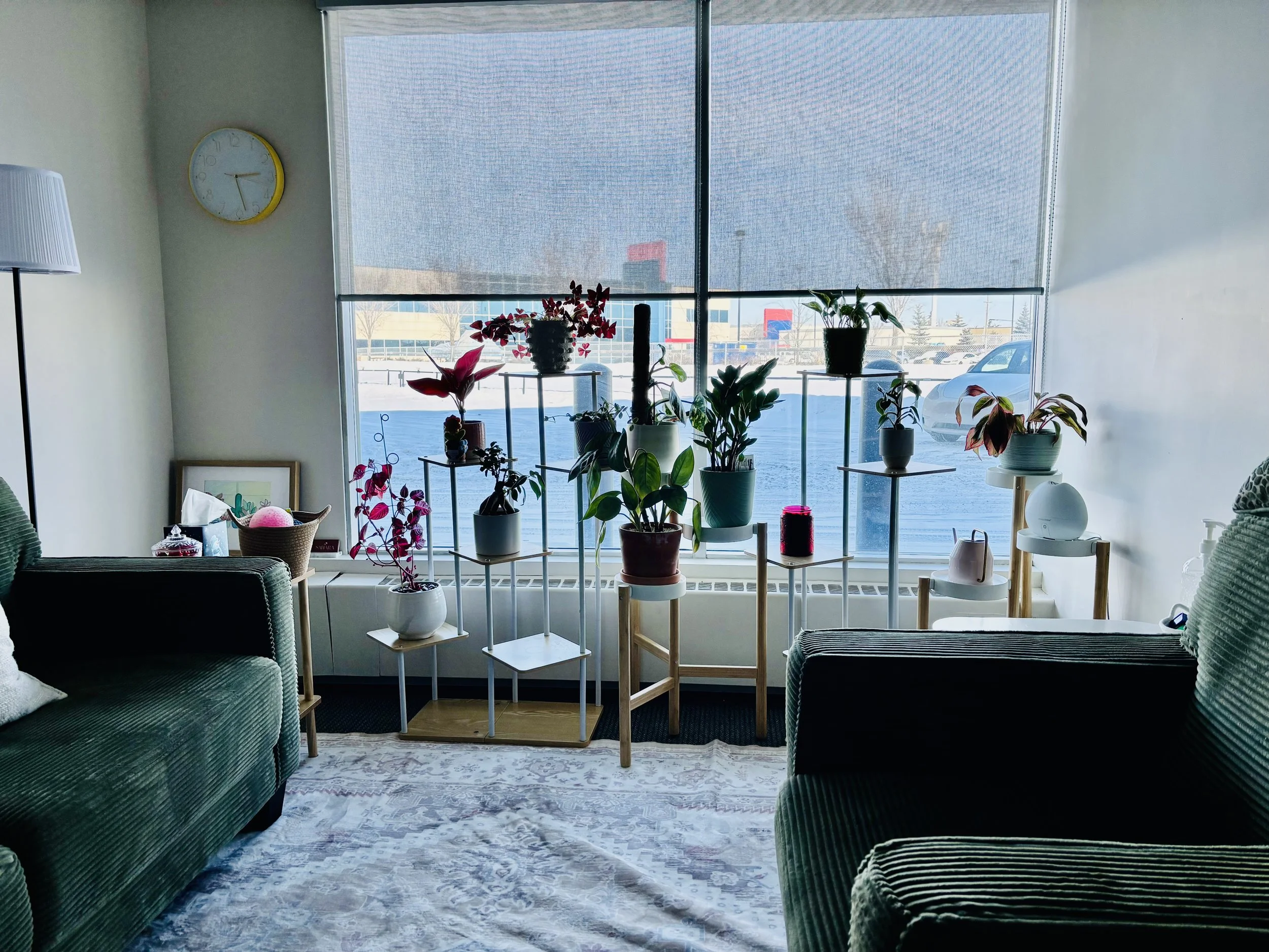Outside of the office, Kiran enjoys spending time with her husband and toddler, watching the Edmonton Oilers win and tending to her large collection of over 50 (!) houseplants! Some of which are featured in the therapy space.